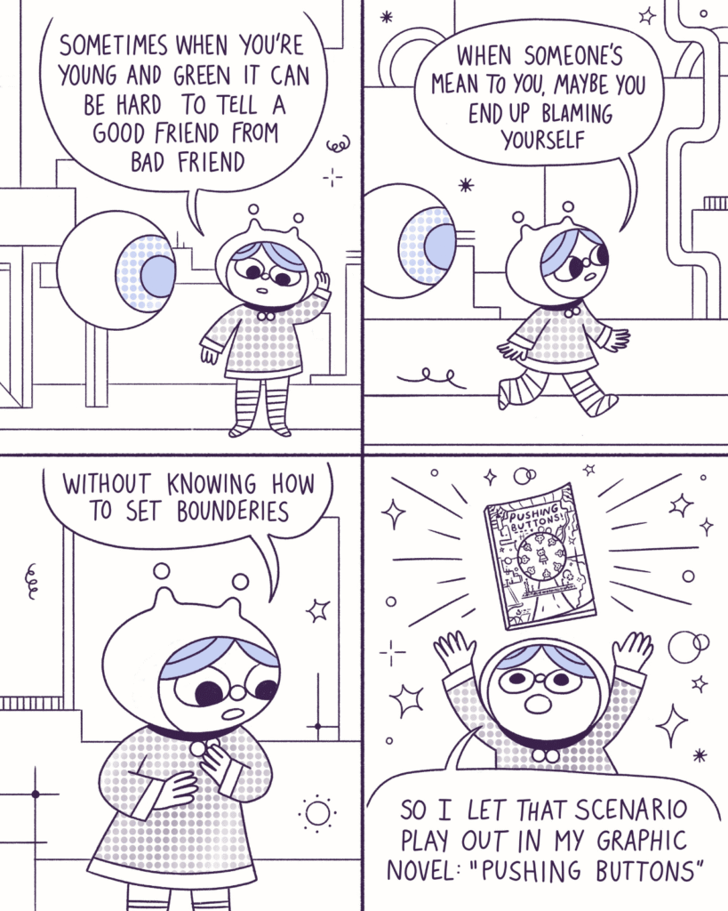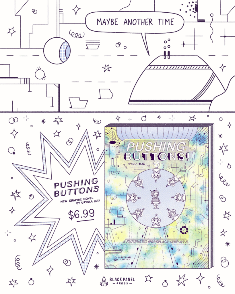 Pushing Buttons by Ursula Blix is an upcoming graphic novel that explores the social complexities of toxic relationships through a simple and relatable story. In our efforts to uncover the inspirations behind this uniquely drawn graphic novel, we attempted to interview Ursula.